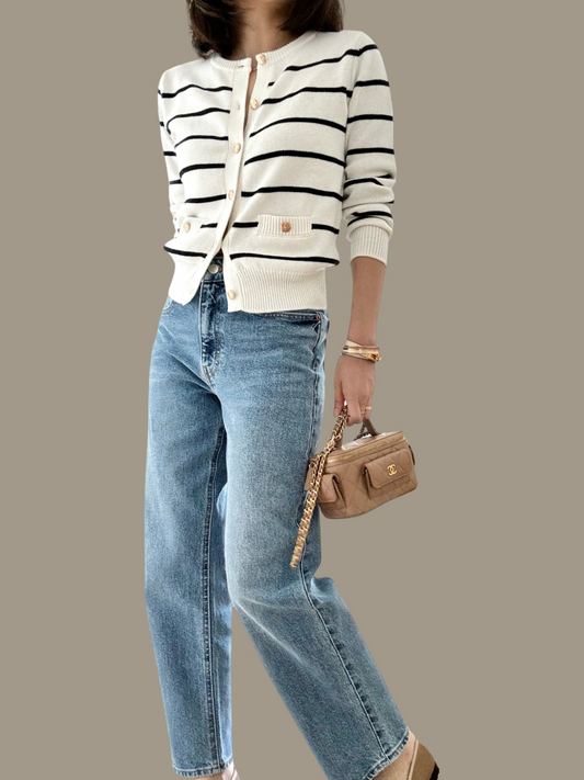Sold Out-Cotton Cashmere Stripe Cardigan- Milk/ Dark Navy