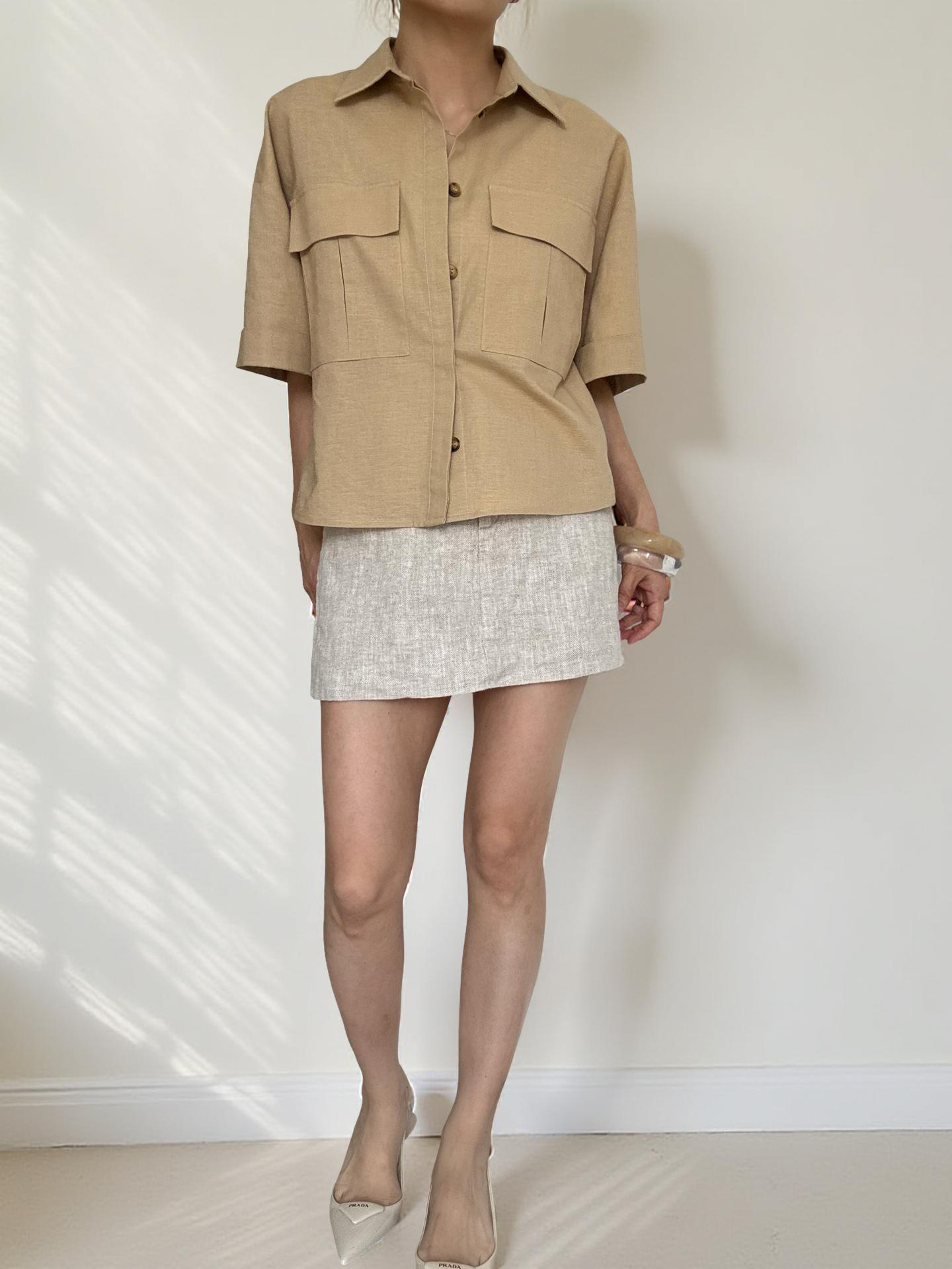 With a relaxed boxy fit and two front pockets, this cotton linen shirt in a khaki desert hue is a sporty and fresh take on a classic linen button down. Made of soft yet weighted cotton linen, this shirt has an easy structure yet is incredibly comfortable and breathable. Pair it with the camel city sleek trousers for some safari chic vibes or contrast it with the cream everyday trousers for the perfect summer fit. The sleeves can be worn at 3 different lengths, wear them long as it is with one fold for a more elegant trapezoidal shape , 2 fold for a more classic boxy crop length and 3 fold for the perfect "rolled up" nonchalant style. Wear it tucked in or out, on its own or over as a crop shacket, there are so many ways you can style this contemporary yet timeless piece!