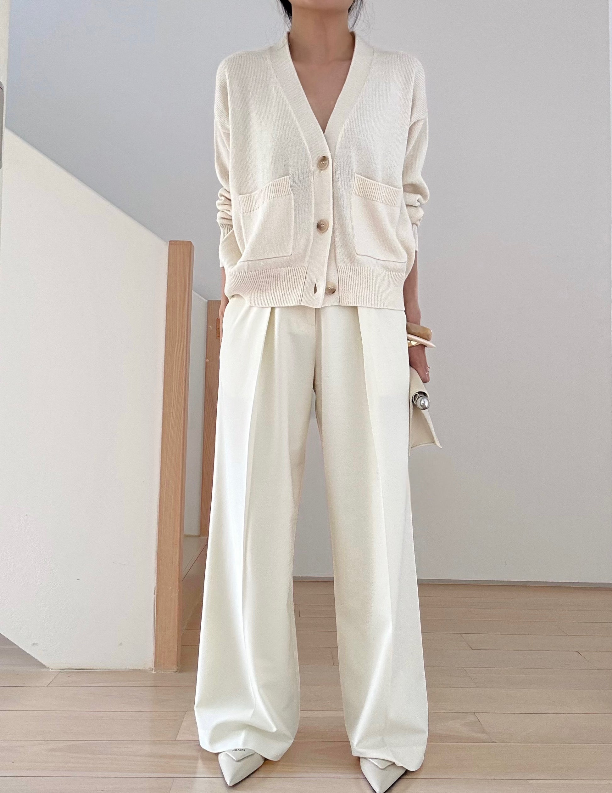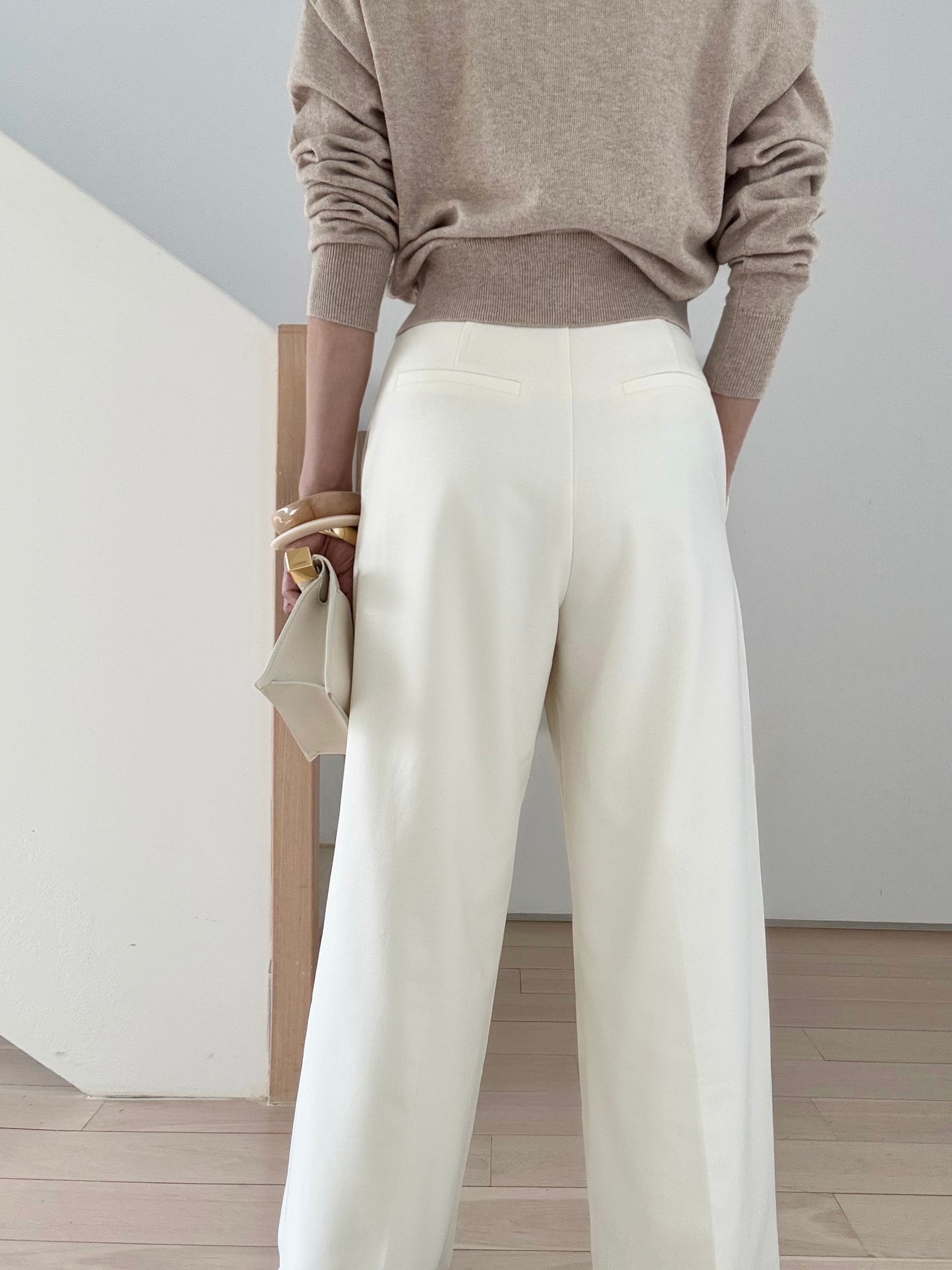 Crafted from a perfectly weighted luxe suiting blend, these creamy trousers have a gorgeous structure yet falls and drapes elegantly. Immaculately tailored and meticulously cut so that it elongates the legs and cinches the waist beautifully, these fully lined trousers feature a hidden adjustable waist band and classic english tailoring pleats ( pleat folds towards the centre) through the front which gives it sartorial chic factor. Whether paired with a crop shirt for summer or knits for fall, these pair of trousers instantly elevate any outfit with impeccable style and an air of quiet confidence. You would find yourself reaching for them all year round, day or night, from work to weekend. ( Beige belt shown in pictures here is included with the trousers)